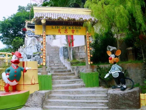Lin Je Kong Temple, situated on the northern end of the Coral Beach, Pangkor Island. Lin Je Kong Temple is a temple for the psychedelics, with giant statues of dragon, mushrooms, mermaids etc. Lin Je Kong is popular with photo-snapping families, Lin Je Kong visits are as much about the sea views as the shrine.